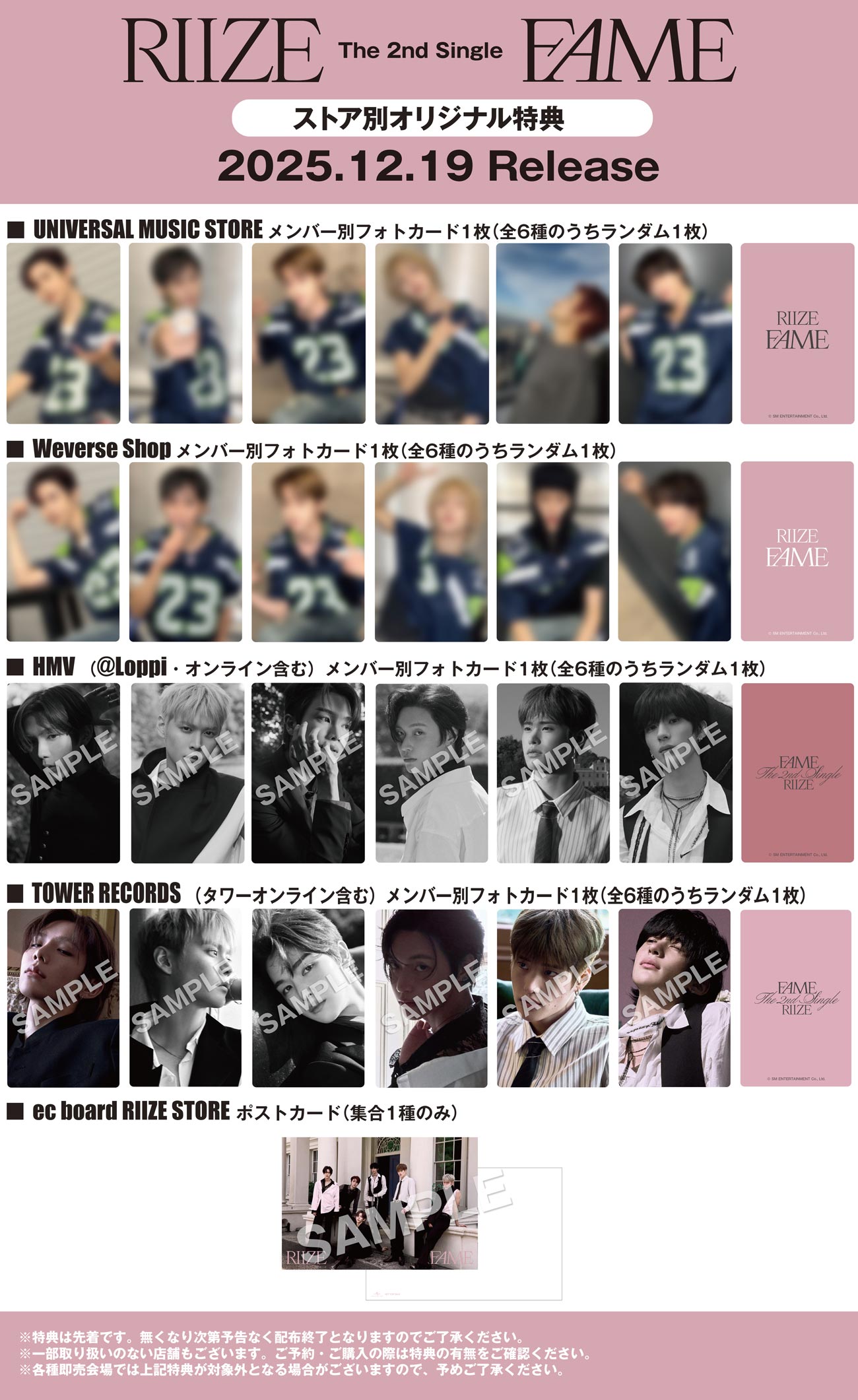 ・UNIVERSAL MUSIC STORE、Weverse Shop、HMV、タワーレコード、ec board RIIZE STOREにてThe 2nd Single『Fame』を1点ご予約・ご購入につき「応募抽選用シリアルナンバー」を1つ差し上げます。