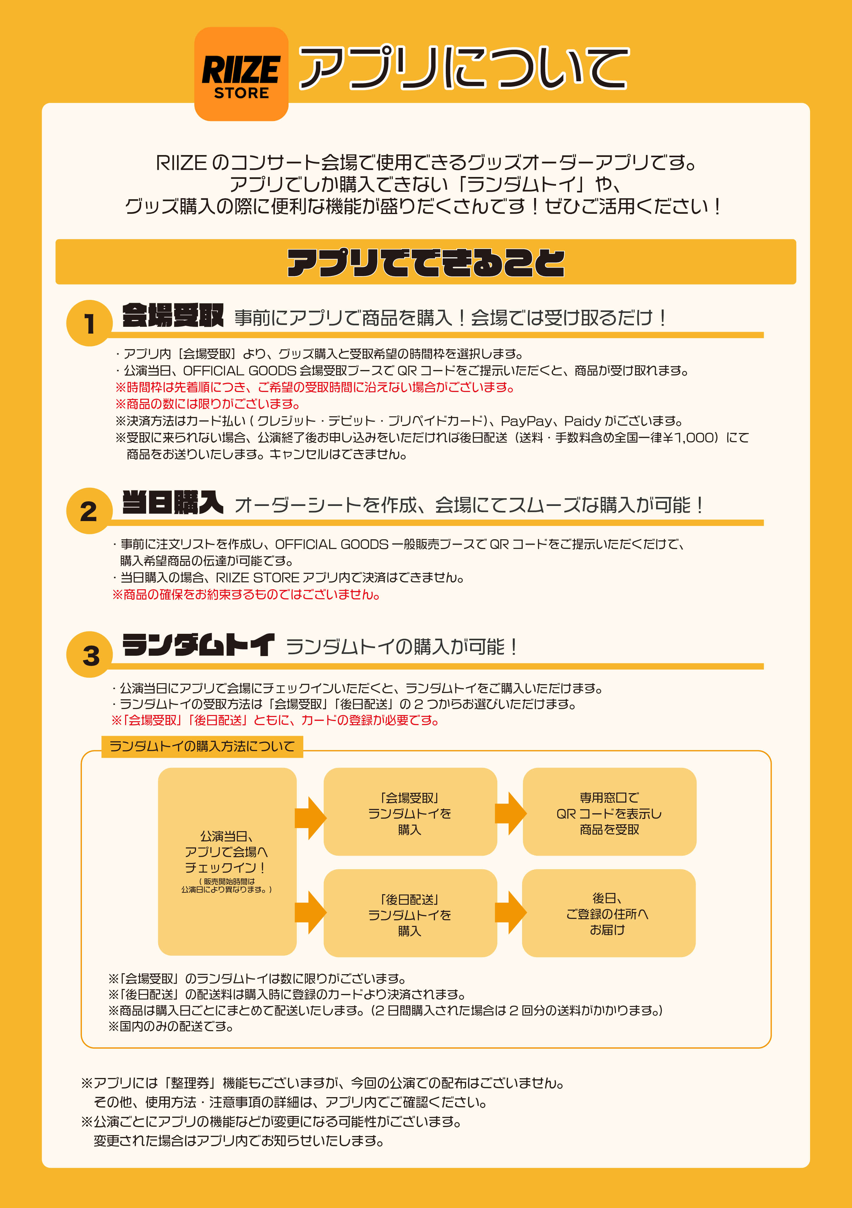 また、今回も「RIIZE STORE」アプリでは、事前にご購入いただいた商品を会場でお受け取りいただける「会場受取」や、 当日の購入がスムーズになる「オーダーシート」の作成、アプリ限定で販売される「ランダムトイ」もご利用いただけます!